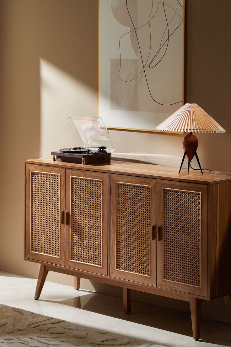 A contemporary sideboard finished in a rich chestnut tone.