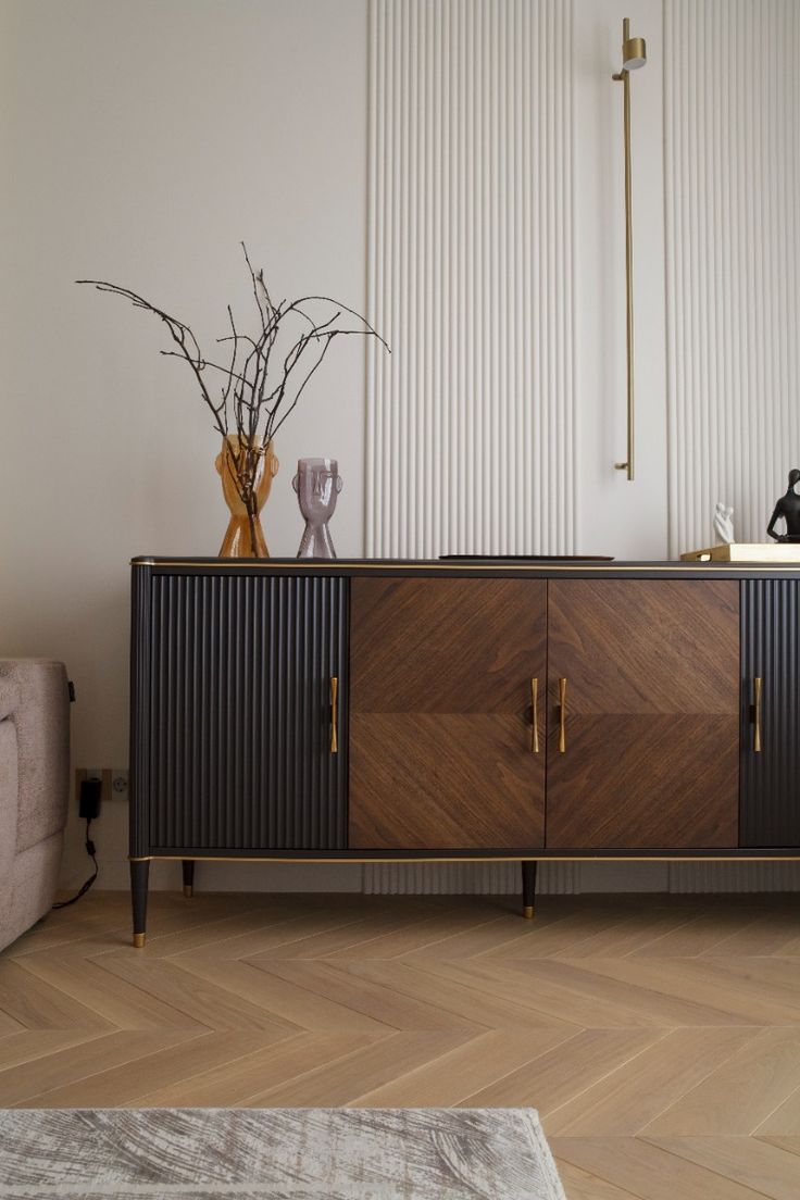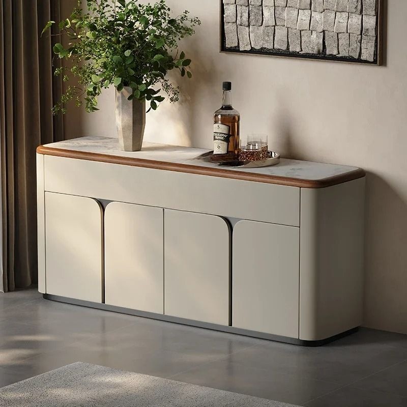 A contemporary sideboard finished in a rich chestnut tone, highlighting natural grain patterns and smooth curved edges. The warm palette creates a cozy, inviting feel. Designed with spacious drawers, enclosed compartments, and solid cylindrical supports, it ensures organized storage with a bold, sculptural identity.